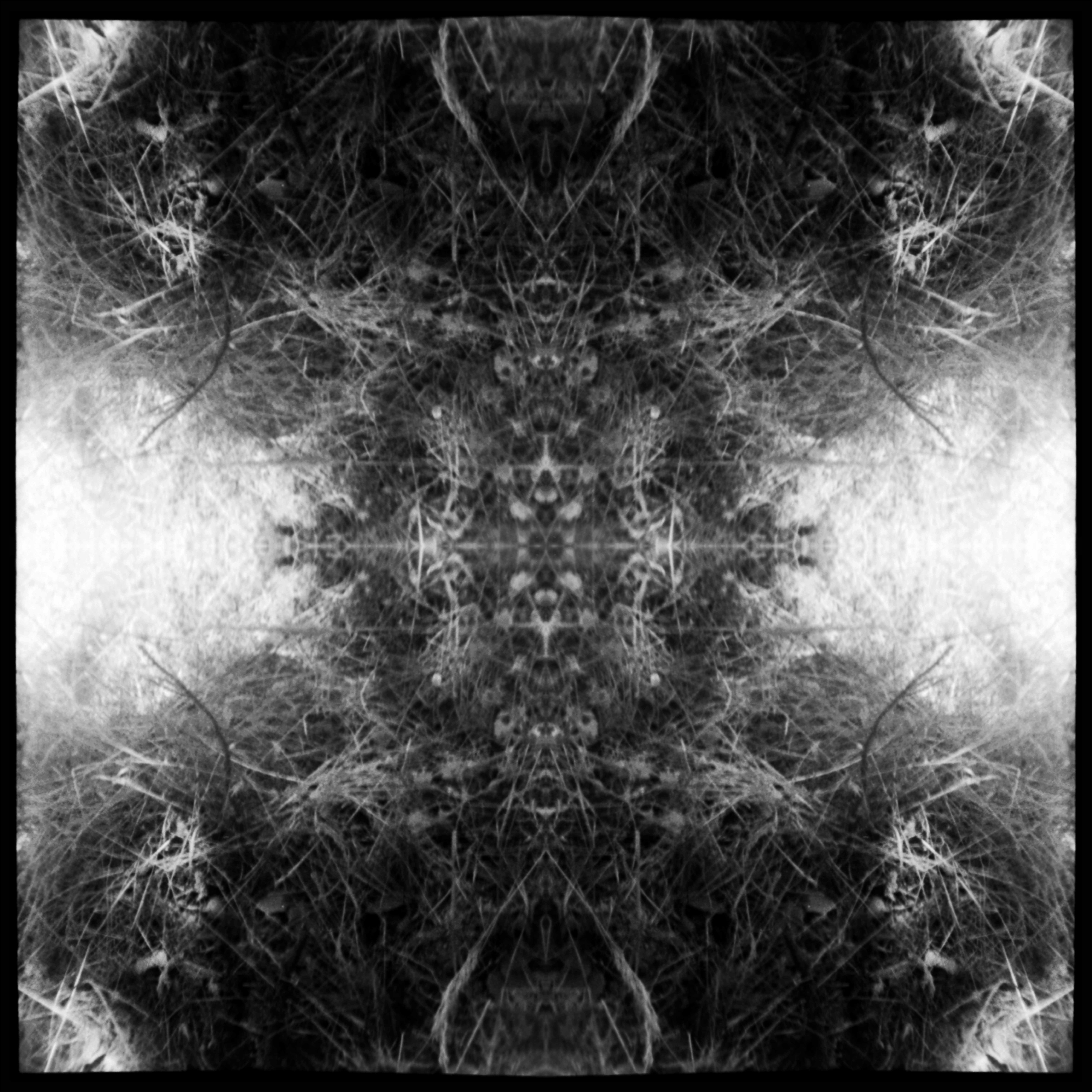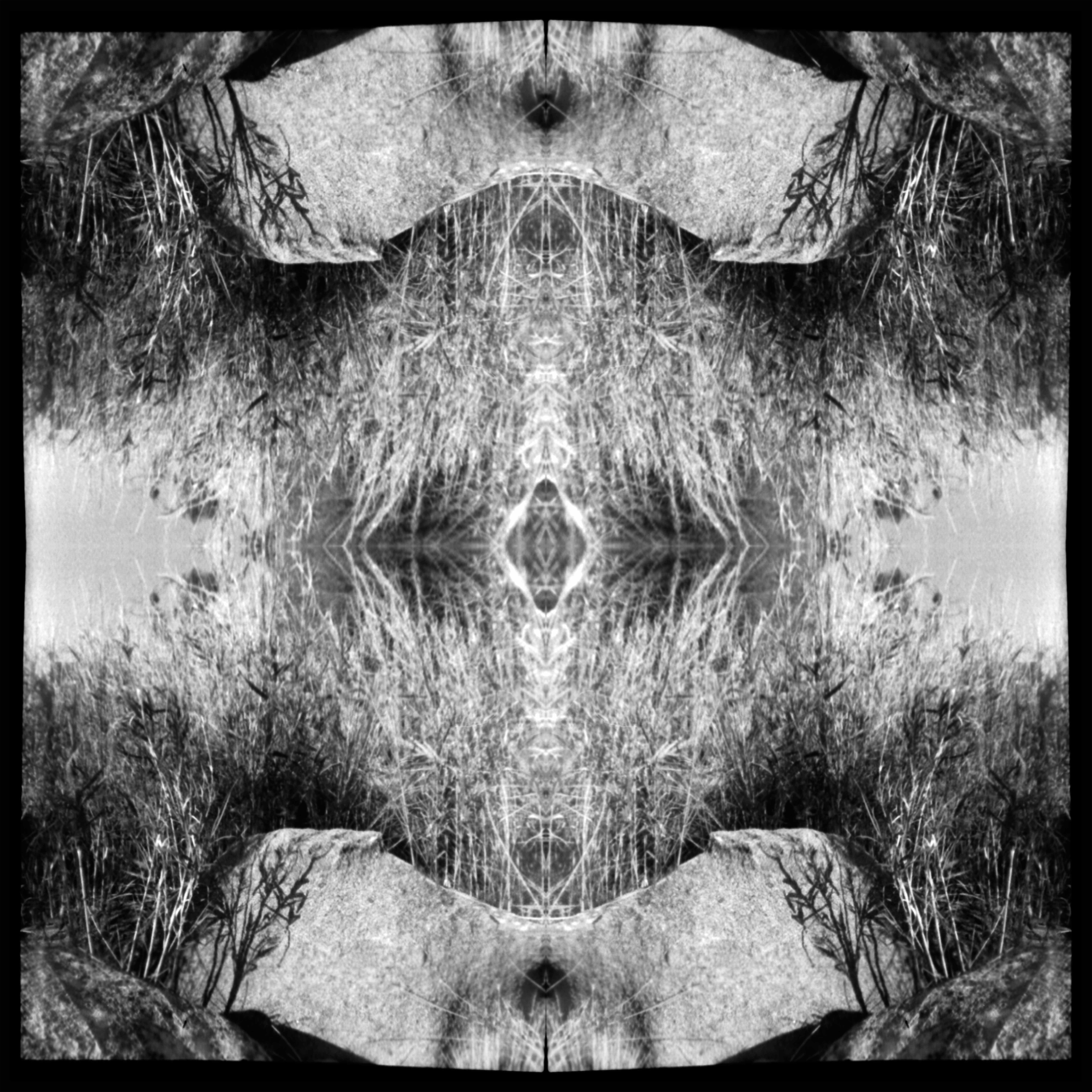 Als Ausgangslage für die Werkreihe psychedelia dienen mir analoge Schwarz-Weiss-Aufnahmen, welche auf Reisen mit einer Pocket-Format-Kamera entstehen. Diese fotografische Bildwelt wird digital vervielfacht und gespiegelt und transzendiert so nicht nur sich selbst und die ihr zugrundeliegende Wirklichkeit, sondern auch unseren Blick auf jene. Durch die Metamorphose realer Objekte und Orte befreie ich sie von der Bedeutungsgenerierung und locke fantastische überirdische Welten hervor, welche von abstrakten Artefakten und kaleidoskopischen Mustern besiedelt scheinen. Solange bis der Blick wieder zurück kippt, den Berührungspunkt der Symmetrien, den Schmelztiegel der surrealen Phantasmagorien, loslässt und das Originalbild wieder isoliert innerhalb seiner Begrenzungen betrachtet wird.